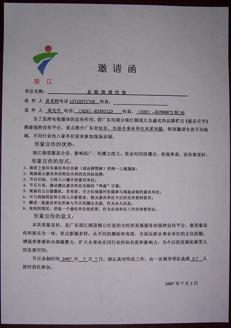 《广东电视台邀请函》